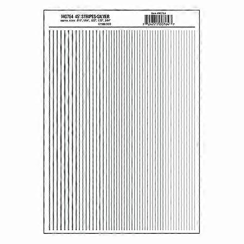 Stripes Silver Dry transferPackage contains one sheet.Sheet size:5 5/8 in x 8 1/4 in (14.2 cm x 20.9 cm)Stripe sizes:0.01 in, 1/64 in, 0.022 in, 1/32 in, 3/64 in (.25, .39, .50, .79, .119 mm)Give your layout, diorama or miniature scene authenticity with dry transfer graphics, numbers, letters and stripes. Easy transfer in seconds to any smooth or textured surface, around contours and into grooves.Position where desired, rub gently and remove the carrier sheet. Suitable for O, HO and N scales.