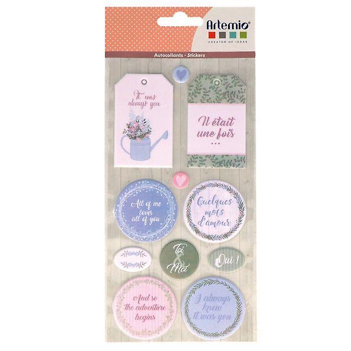 Plank of puffs from the Love Story collection. These stickers represent sentences in English and French with a garden decoration: watering can, plants, flowers. Love messages will suit for Valentine's Day or for a love letter: It was always you, Once upon a time, A few words of love, All of me loves all of you, Yes, You & Me, I always knew it was you, And so the adventure begins, as well as small puffies pink and blue heart.