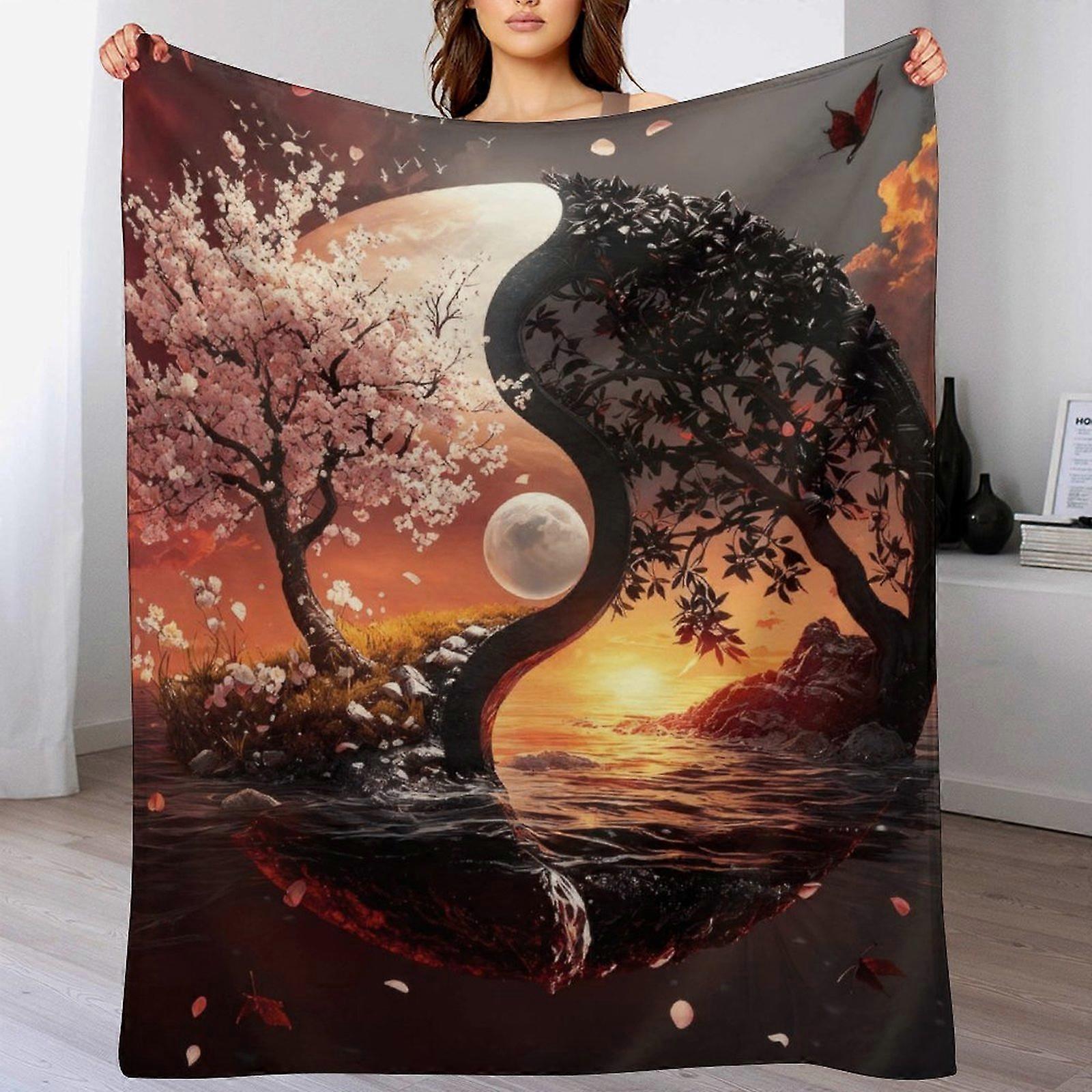 Yin-Yang Dual Tree Print Flannel Blanket - Cozy Warm Throw | Zen-Themed Decor for Wellness Enthusiasts