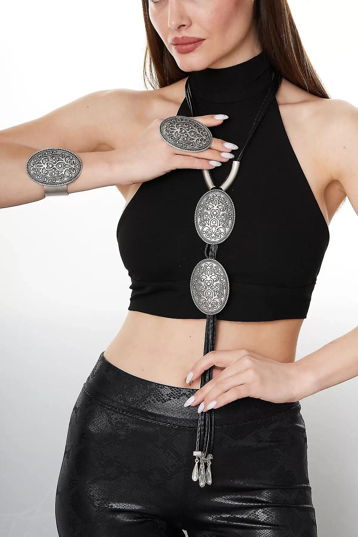 ZeyDor Embossed Circle Leather Necklace Ring&Bracelet Set