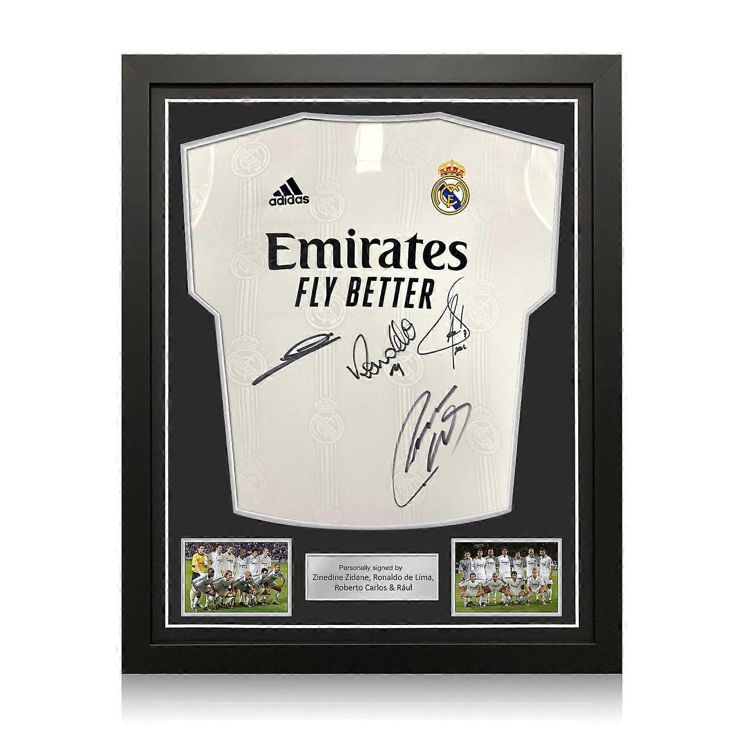 Zinedine Zidane, Ronaldo de Lima, Roberto Carlos & Raul Signed Real Madrid Football Shirt. Standard Frame