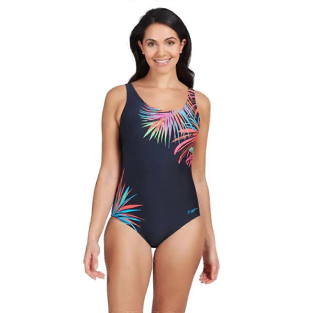 FEATURES Chlorine resistance UPF 50+ sun protection Foam cups - fits B-E cup size Mush tummy control Adjustable straps Shape retention Medium leg height Ecolast+ fabric - made from recycled plastic bottles The Maya Adjustable Scoopback Swimsuit from Zoggs features vibrant leaf prints. The adjustable wide straps offer the perfect fit with scoopback, mesh tummy control, and full foam cups for support. Made from eco-friendly Ecolast+ fabric, this swimsuit is quick-drying, durable and 100% chlorine resistant. Note: The model is 5'7 and wears a size 10