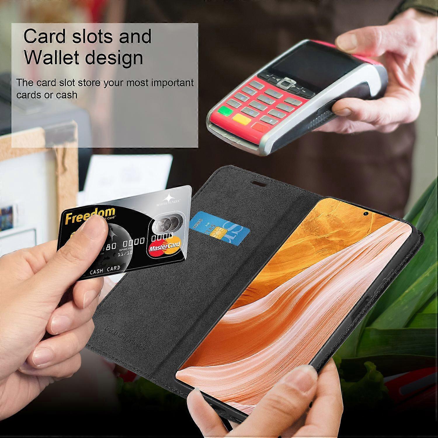 DESIGN: Ultra dünne Handytasche im Book-Style mit Kartenfach, Standfunktion, integriertem TPU Silikon Case und einem magnetischen Verschluss ohne störende Lasche.